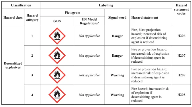 Updated hazard classes and classification criteriaRevised hazard classifications for aerosols, desensitized explosives, flammable gases, and chemicals under pressure (a new category within the aerosols class).