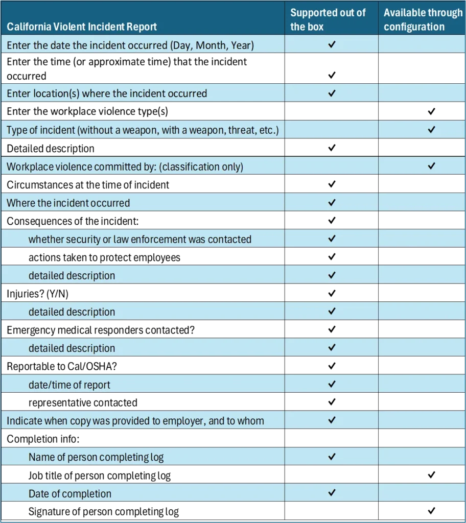The VelocityEHS Safety Solution’s Incident Management capability accommodates Cal/OSHA workplace violence prevention program reporting requirements. In addition to our comprehensive OSHA Injury and Illness Recordkeeping compliance functionality, we give California employers the unique configurability options to tailor their incident recordkeeping and reporting systems to meet Cal/OSHA’s specific requirements for workplace violence incident reporting. Here’s a rundown of our workplace violence incident reporting configuration options:
