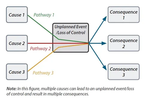On the other hand, when we use risk bowties, we have an easier time understanding how multiple causes can lead to an accident, which then can result in multiple potential consequences. Look how easily a bowtie diagram conveys information about multiple causes and consequences in the figure below.