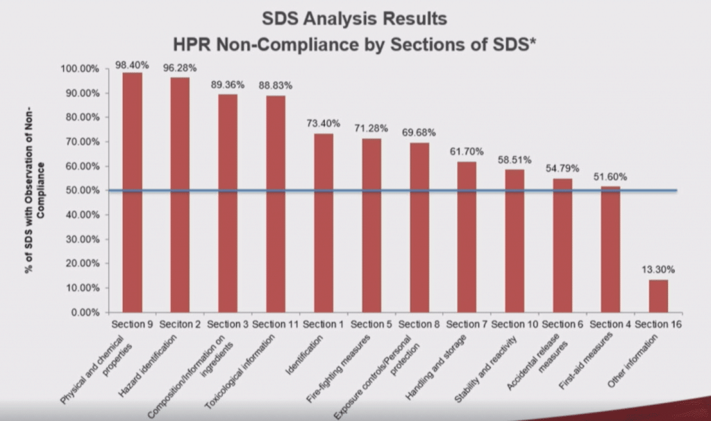 Dr. Godard also presented the results of Health Canada’s recent Safety Data Sheet Audit Project. The audit looked at 188 publically available SDSs selected from manufacturers spread across multiple provincial and territorial jurisdictions, and which covered a variety of product hazards. These SDSs were then assessed for compliance with the requirements of the Hazardous Products Act (HPA) and Hazardous Products Regulation (HPR). The audit looked specifically at the presence, completeness, ambiguity and accuracy of hazard information contained in the various sections of the new 16 section GHS SDS format, and discovered some surprising results.
