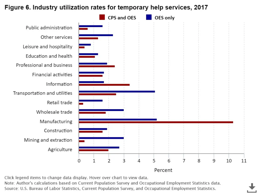Temporary employment in manufacturing also continues to significantly outpace the average utilization rate compared to other industries. A 2018 BLS report analyzed data from the US Census Bureau’s Current Population Survey (CPS) and the US Department of Labor’s Occupational Employment Statistics Survey (OES) and revealed that since the Great Recession (2008-2017), utilization of temporary employees in the manufacturing industry ranged between 5.2% and 10.3%. Compare this to the overall average of around 2.0% for all industries during that same period.